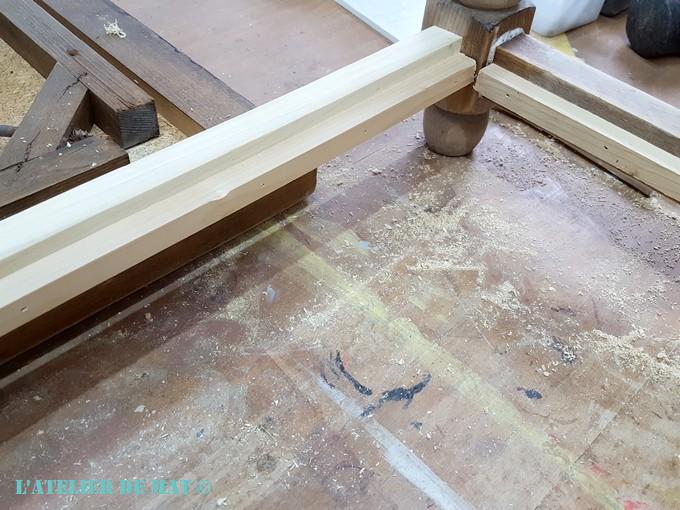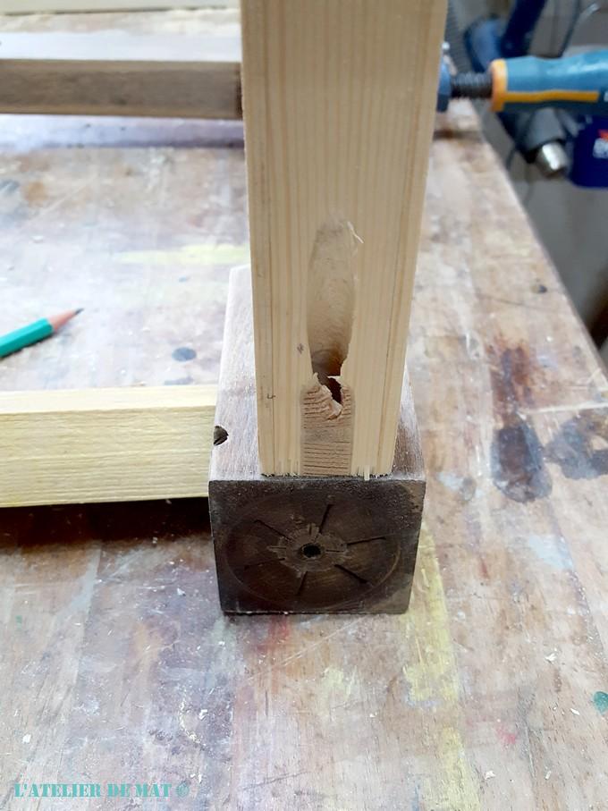Je pensais que j’allais me trouver face à un assemblage tenon/mortaise collé mais il n’en est rien. Un tire-fond dans chaque angle maintient tout en place.
