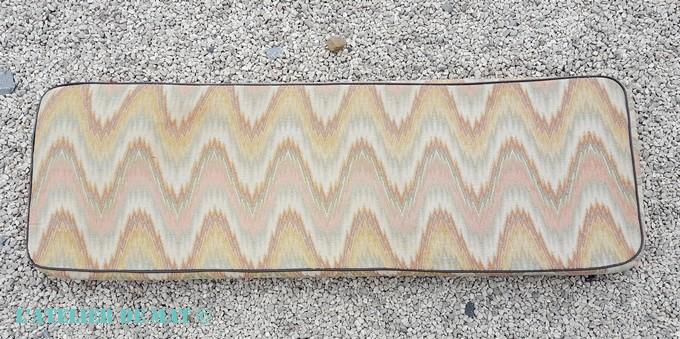 Non, ce n’est pas la peine de régler votre écran ou de passer chez l’ophtalmo, votre vue ne vous joue pas des tours. Et ce n’est pas non plus le tissu final pour l’assise. Il s’agit en fait d’une ancienne assise de caravane je pense. J’en ai récupéré quelques unes cet hiver dans un grenier.