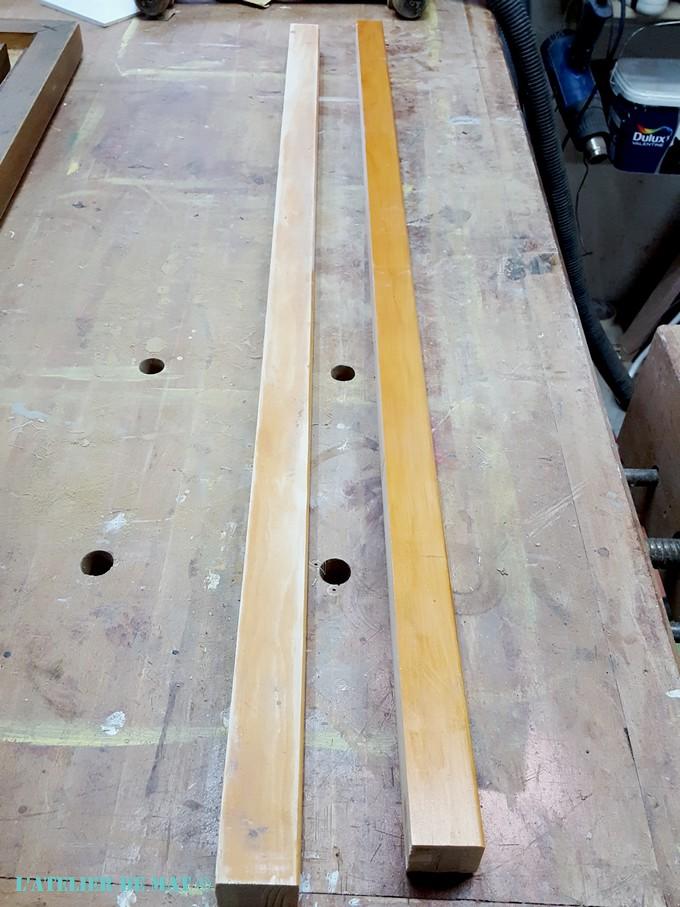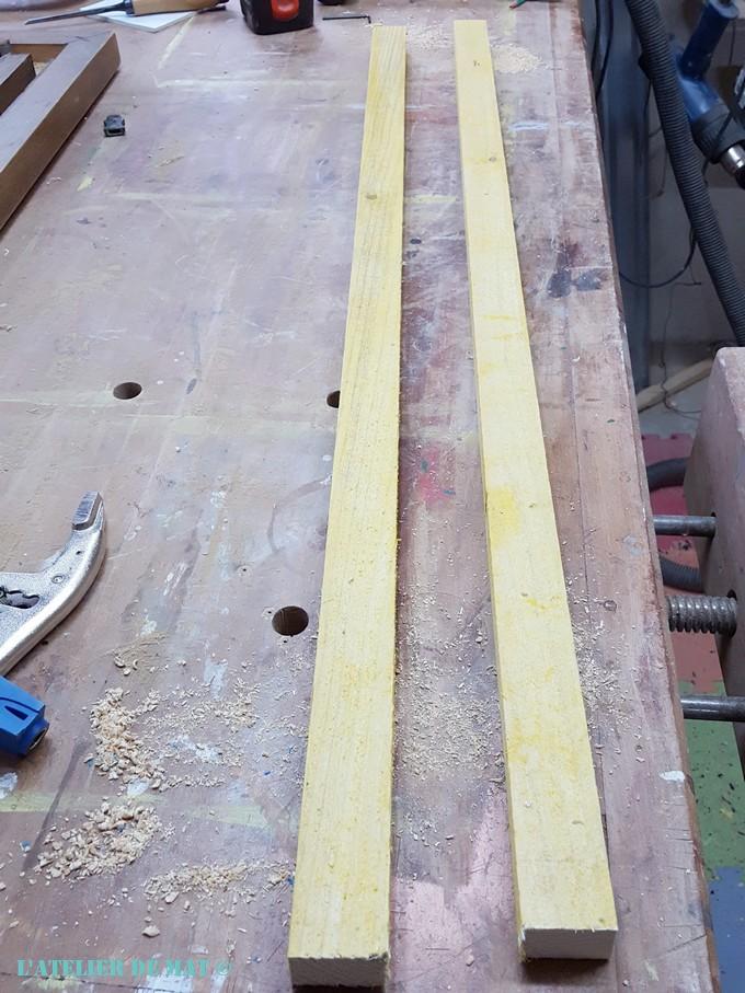 La fabrication des 4 traverses a nécessité de trouver du bois assez long et de bonne section. Par chance j’avais récupéré quelques jours avant des chutes de découpe d’un volet en sapin chez mon voisin. Je m’étais dit que cela me servirait bien un jour. Celles-ci ne prendront pas la poussière dans un coin de l’atelier pour une fois car je vais pouvoir en tirer deux traverses.;)