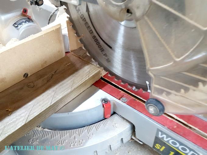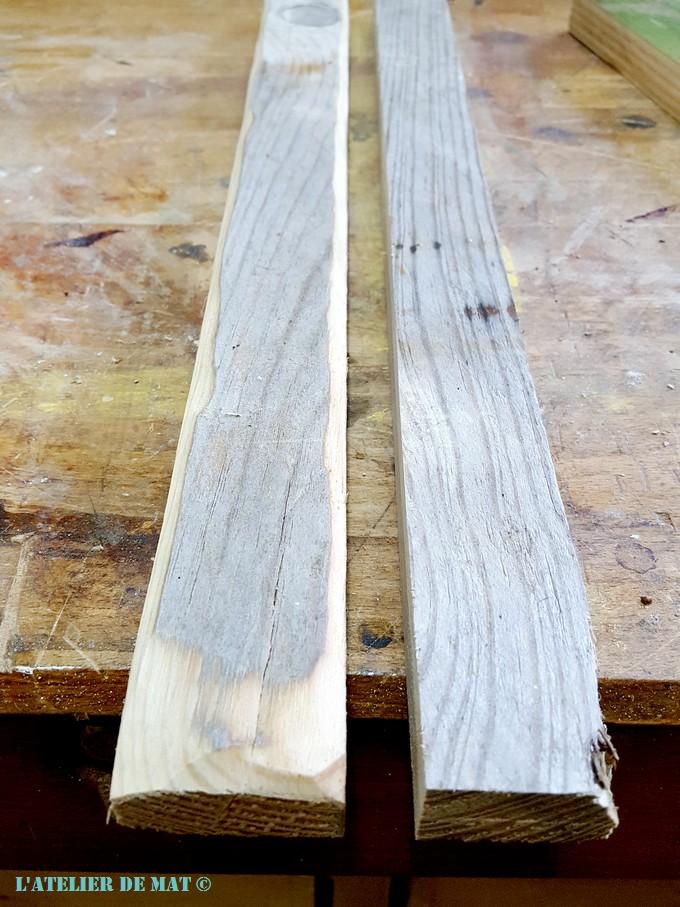 Les planches étant trop larges (7 cm) j’ai choisi de les couper en deux afin que le support ne soit pas trop « massif ». J’ai effectué cette opération avec ma scie sur table mais si vous n’en disposez pas, cela est facilement réalisable à la scie sauteuse.