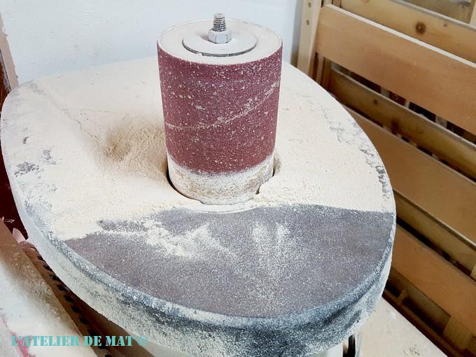 C’est réalisable, bien entendu, de tout faire à la main mais la technologie étant là pour nous aider alors pourquoi s’en priver 😉 Surtout pour une tâche aussi passionnante que le ponçage ! À l’atelier je dispose de cette ponceuse oscillante et elle va bien servir pour ce projet. C’est juste un tambour qui tourne et qui en même temps oscille de bas en haut. Pas génial pour poncer droit mais c’est justement ce qu’on recherche .