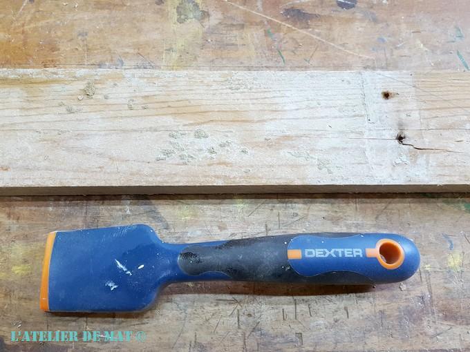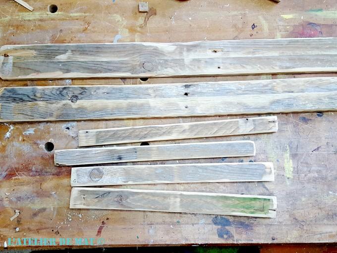 Après avoir fait le tour de l’atelier et rassemblé les chutes de palettes que j’ai pu trouver je me suis lancé. Certains morceaux avaient du béton séché dessus alors avant de les couper , j’ai utilisé mon grattoir à peinture pour les nettoyer.