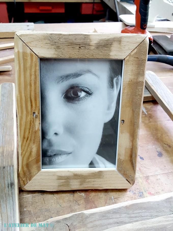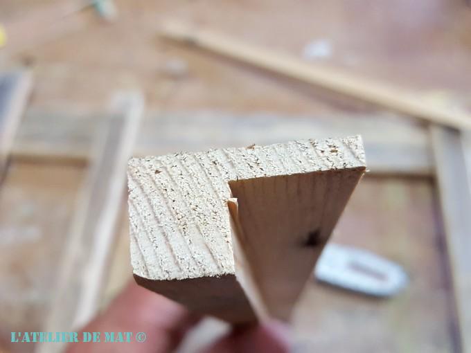 Je n’avais pas de baguette d’angle à l’atelier donc j’ai choisi de faire un surcadre avec les chutes de palettes qu’il me restait. À l’aide de ma scie sur table j’ai récréé des baguettes d’angles « maison ».