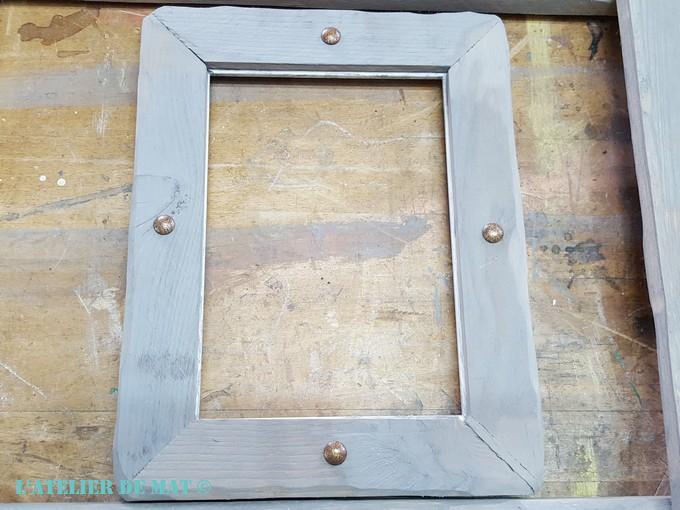 Voici à quoi ressemble le premier cadre une fois habillé. J’ai passé le cadre à la ponceuse pour récréer le même effet d’usure que sur le support.