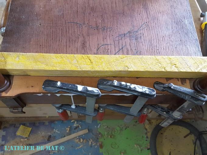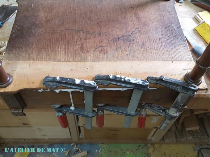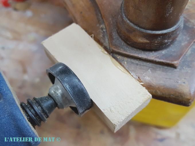 Il ne me restait plus qu’à tailler des nouveaux goujons en n’oubliant pas d’inclure la nouvelle épaisseur du plateau réparé dedans ;), et de coller le tout.