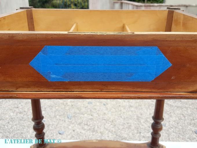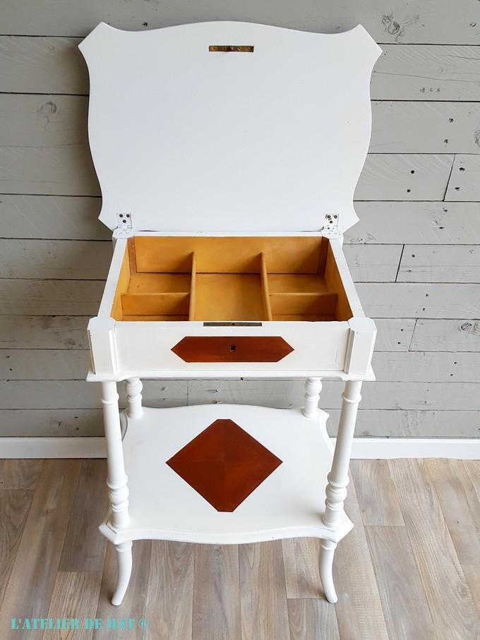 Le dessus de la travailleuse était assez banal mais j’ai quand même tenu à faire ressortir l’aspect du bois même si celui-ci n’est pas en marqueterie.
