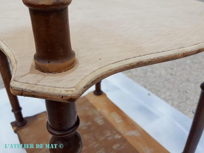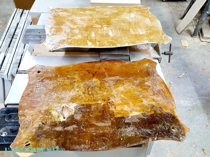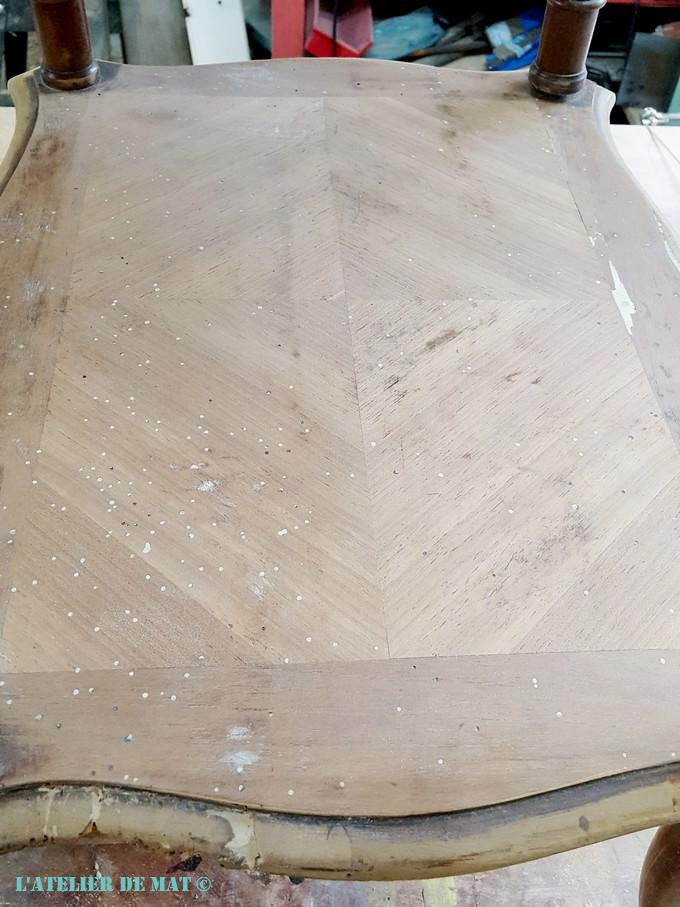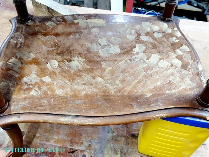 Pendant ce temps, je me suis occupé du problème du placage. Celui à l’envers du plateau était tellement abîmé, que l’enlever m’est apparu comme la meilleure solution. Au départ il se décollait bien mais cela s’est compliqué par la suite.
