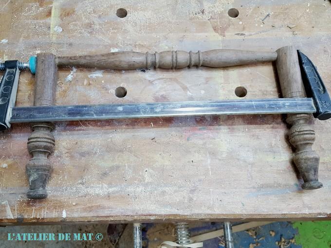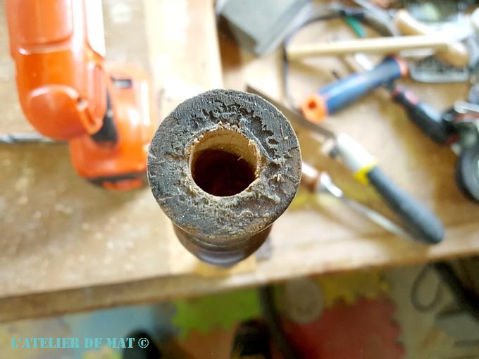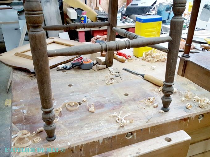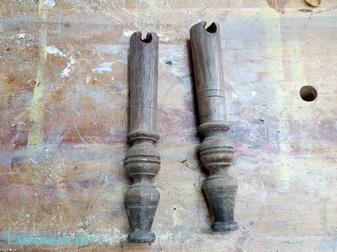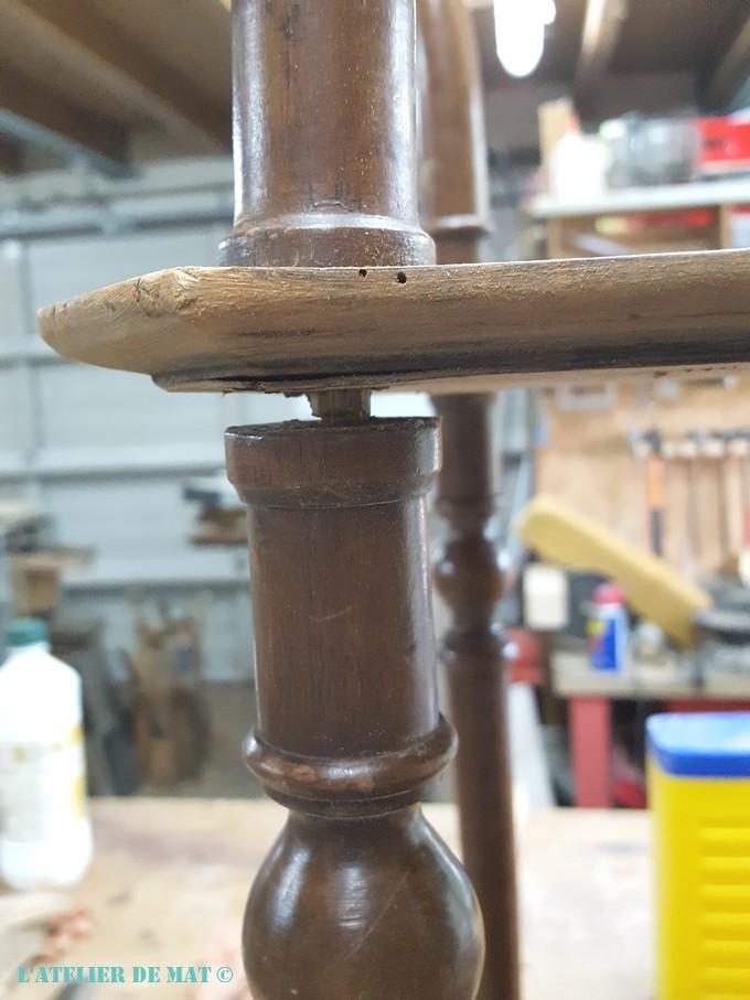 Pas de chance cependant car le trou pour le barreau (la mortaise) est exactement au niveau de la coupe. Pour les boucher, le plus simple a été de coller l’ancien barreau dedans.