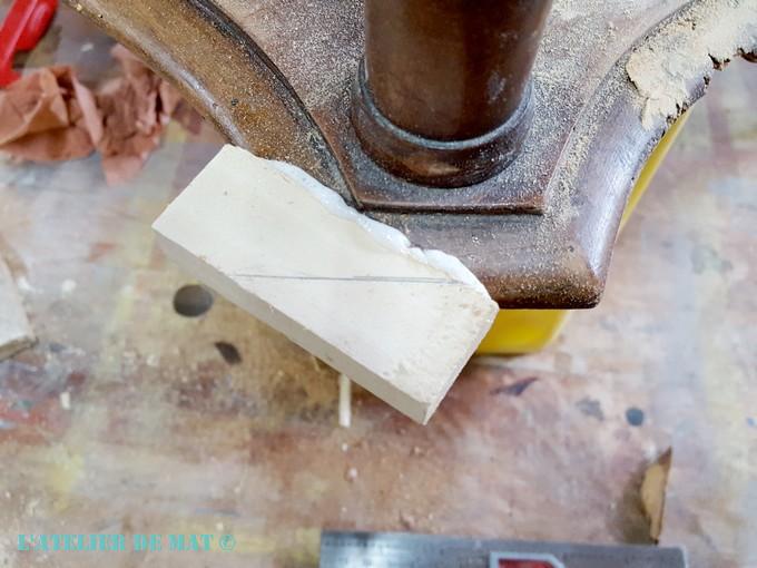 J’ai coupé la partie abîmée à la scie à main puis j’ai taillé un morceau de tilleul que j’ai collé à la colle polyuréthane. J’ai choisi du tilleul car cela se travaille bien et comme ici il va falloir recréer un angle et une courbe , ce bois me paraissait tout indiqué.