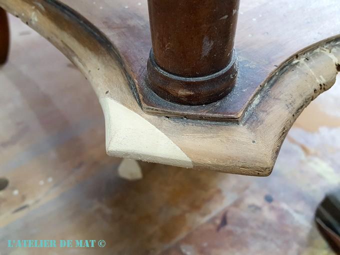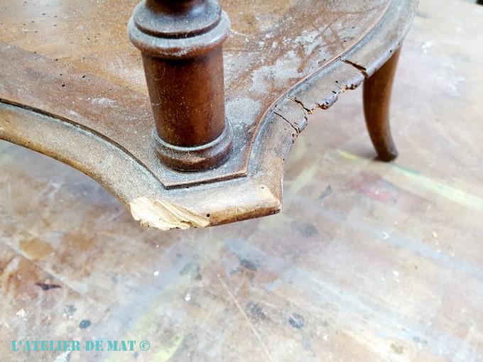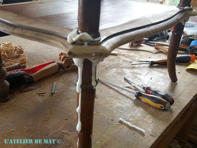 Maintenant que cette opération est faite, il est temps de redonner 4 pieds à notre petite travailleuse. C’est vraiment dommage que ce pied soit manquant et n’est pas pu être retrouvé, car les trois autres sont assez élégants. Pour le remplacer j’ai pensé et même brièvement essayé d’en refaire un au tour à bois mais je ne dispose pas du matériel nécessaire. Et en regardant de plus près, je me suis aperçu qu’un autre des pieds ne tenait plus (le pied est en haut sur la photo)