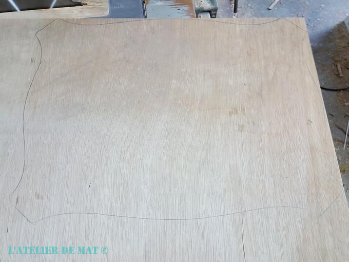 Le plateau dans son ensemble devait donc être renforcé car trop fragile en l’état. Par chance j’avais des grandes chutes de contreplaqué de 5mm de disponible. J’ai reporté le tracé du plateau sur l’une d’entre elles et j’ai effectué la découpe avec ma scie sauteuse.
