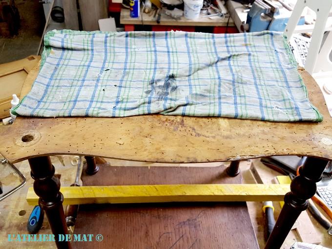 J’ai alors utilisé la technique du torchon humide pour décoller le reste. Vous savez, on mouille un torchon et on le pose sur le placage. Après quelque temps celui-ci s’enlève bien et en principe le tour est joué.