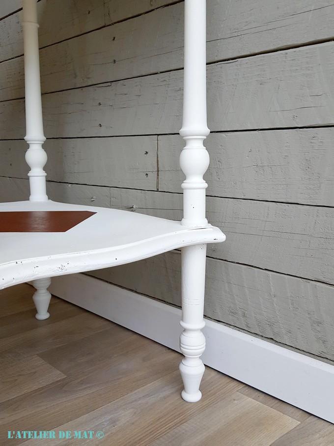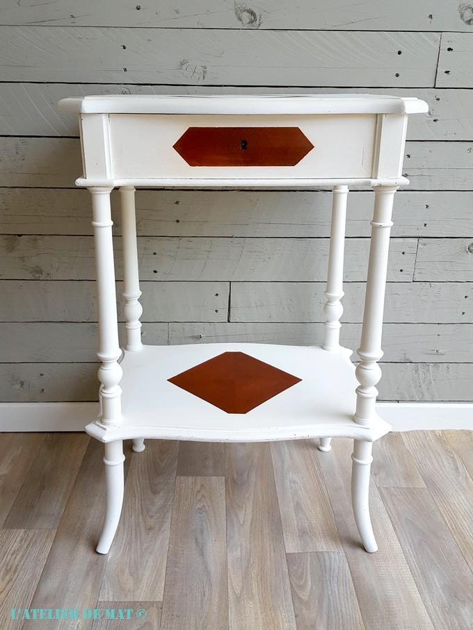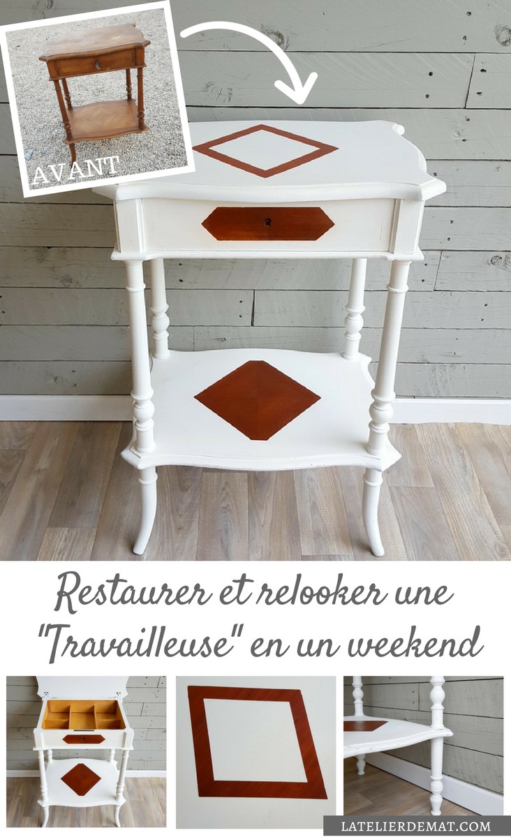 Avec toutes ces pièces rapportées (les pieds arrières, le dessous de plateau, le nouvel angle) et tous les trous de vers, la seule finition envisageable était de peindre la travailleuse. C’est dommage car elle avait de jolies parties en marqueterie. N’arrivant pas à m’y résoudre je pense avoir trouvé un compromis. J’ai teinté couleur acajou certaines parties que j’ai ensuite masquées.