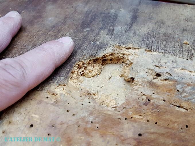 Je dis bien en principe car il y avait un petit trou dans le placage et je voyais que c’était un peu « creusé » en dessous. Pas grave à première vue mais en continuant d’enlever le placage il s’est avéré que ce n’était pas un trou mais un gouffre abyssal ! Plus je grattais, plus j’enlevais du bois mort. Le fond du trou n’est autre que le placage de l’autre côté du plateau. La planche a complètement été dévorée.