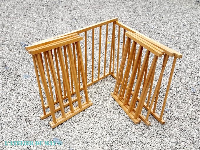 14. Avec ces pièces de parc pour bébé, je me dis des fois que je récupère trop de trucs mais c’est plus fort que moi. J’ai beaucoup de mal à accepter de voir un beau bois comme ce parc en hêtre partir à la déchetterie. J’ai trouvé tout cela en même temps que les cadres en numéro 9. Je sèche complètement niveau idées pour réutiliser ces pièces pour le moment. Au pire je pourrais toujours récupérer les tourillons.
