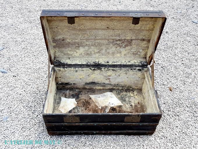 13. Quand on m’a proposé de me donner cette malle j’ai accepté car celle-ci était quasiment complète. Elle a toujours ses serrures et toutes ses ferrures. Retrouver des pièces manquantes pour une vieille malle est une vraie galère, alors si vous avez le souhait d’en refaire une un jour, soyez vigilants et vérifiez qu’il ne manque pas grand choses dessus.