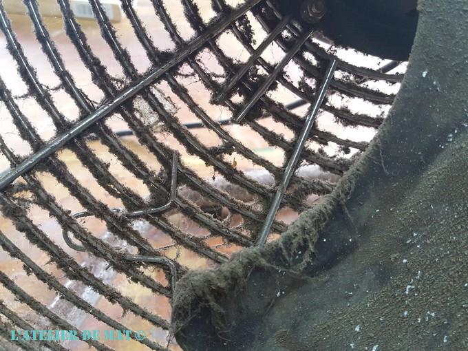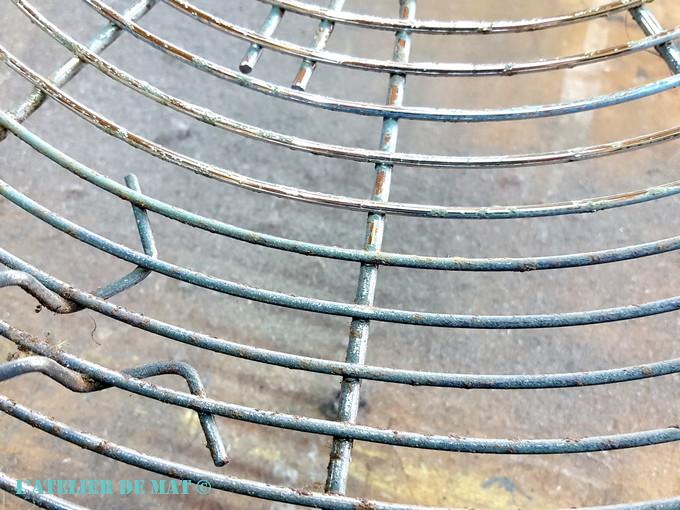 Hélas c’est souvent quand on pense que cela va bien se passer qu’on découvre le hic. Après avoir enlevé toute cette poussière agglutinée dans les grilles, j’ai découvert qu’il y avait des points de rouille un peu partout, mais aussi de la peinture de différentes couleurs sur chaque grille !! Je pense que ce ventilateur devait être utilisé dans un local ou cabine de peinture pour extraire l’air. La solution la plus efficace que j’ai trouvée a alors été de frotter à la laine d’acier 000 les deux grilles et ce recto verso.
