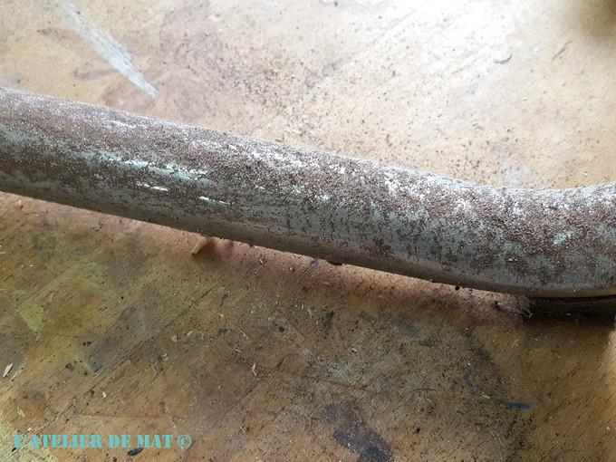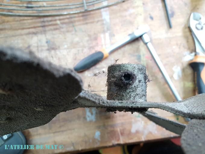 Le même traitement a été appliqué sur le pied. Celui ci comportait plus de rouille que les grilles mais étonnamment pas de peinture. Heureusement que le ventilateur n’était pas plus grand car à la fin j’avais des crampes dans les doigts, quelques bouts de peau en moins mais surtout plus de laine d’acier;) Un paquet entier a été nécessaire pour le nettoyage ! Fiou.