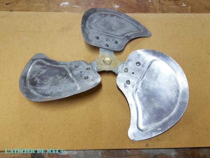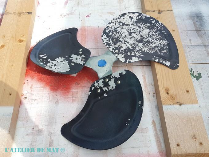 Mais dans un moment d’optimisme inconsidéré, j’ai peint l’hélice.! Et oui, comme cela vous est peut être déjà arrivé , je me suis dit que la peinture rattraperai les manques et que le résultat serait parfait. Et devinez quel à été le résultat….: une horreur absolue !! Je le sais pourtant que la peinture ne fait pas de magie mais j’étais tellement émerveillé par les qualités de la peinture Rust-oleum que je venais d’utiliser pour le reste, que je me suis un peu enflammé;) Sauf que la peinture pour l’hélice était d’une marque moins réputée et que cela ne l’a pas fait du tout. Je n’ai même pas pensé à faire une photo tellement j’étais fâché contre moi.