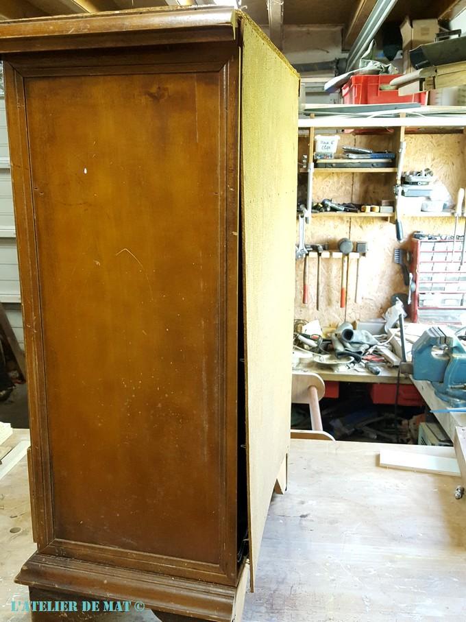 Le dernier point que j’avais à régler était le fond du meuble. J’ai longtemps hésité sur la solution que j’allais choisir. Le fond d’origine était un peu abîmé et pour le faire tenir, j’allais devoir enlever toutes les agrafes d’origine. Cela serait long et je n’étais pas fan de réutiliser ce fond car il avait un peu pris l’eau. J’ai ensuite pensé mettre un contreplaqué fin, mais là il fallait le poncer des deux côtés puis le peindre pour que cela soit propre. C’est alors que je me suis rappelé que j’avais des fonds de meuble qui traînaient. La face interne étant blanche et je n’avais donc qu’une face à peindre. Allez hop, quelques agrafes et le meuble avait son nouveau fond.