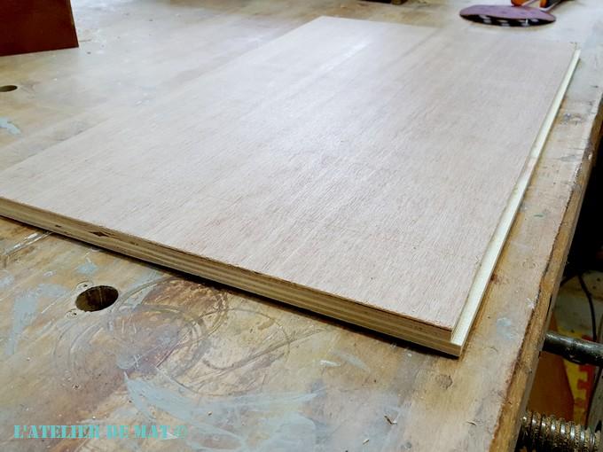 Il me restait plus donc qu’à assembler le contour au nouveau plateau. Pour cela j’ai encollé le contour et avec mon pistolet pneumatique, j’ai assuré la fixation en disposant quelques clous. C’est rapide, efficace, et avec un peu de mastic à bois, j’ai bouché les trous laissés par les clous et les petits espaces qu’il y avait par endroits entre le plateau en contreplaqué et le bord.