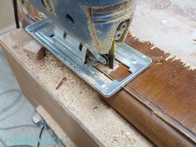 Bon sinon, il était essentiel de ne pas abimer l’encadrement mouluré en bois massif du plateau, alors j’ai effectué une découpe à la scie sabre dans le plateau.
