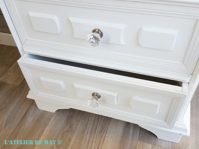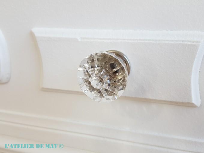 J’ai pensé conserver les poignées d’origine et après les avoir peintes en blanc cela ne le faisait pas du tout. Pas de regret car ce modèle est tellement plus sympa. Il apporte la petite touche qui fait remarquer le meuble et lui donne sa petite touche d’unicité.