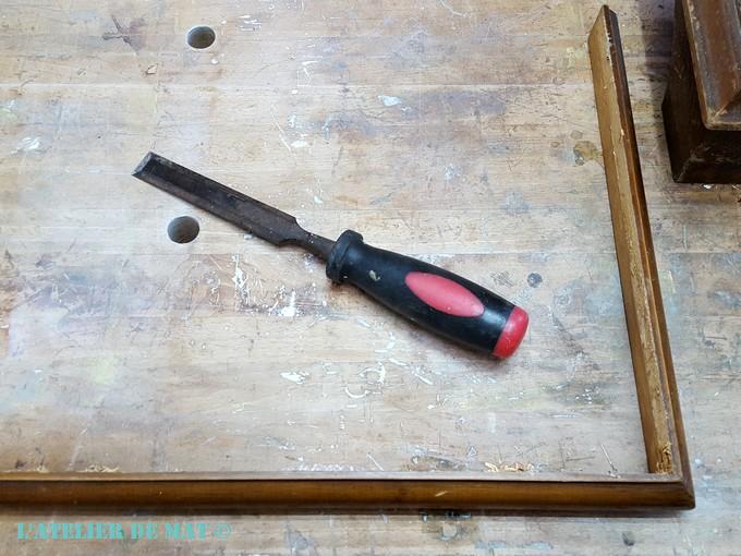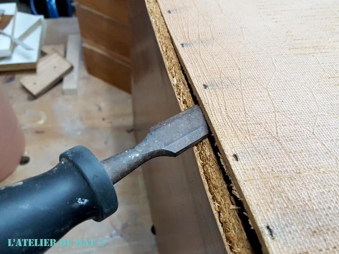 Toujours équipé de mon vieux ciseau, j’ai nettoyé les restes d’aggloméré et de colle qui s’obstinaient et j’ai enfin pu extraire l’encadrement de plateau sans aucune casse. Houra !