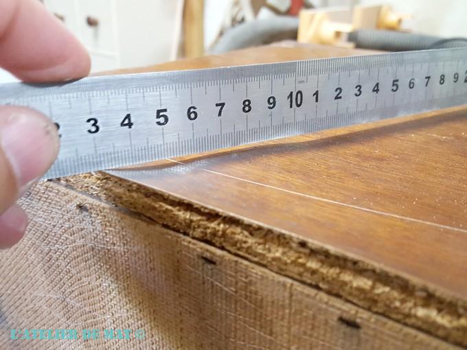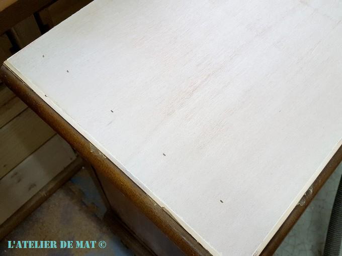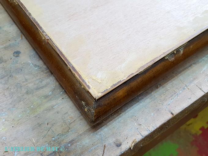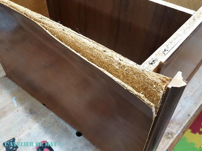 Juste en tirant avec les doigts, j’ai pu décoller le « placage »et je ne suis pas Hulk. Comme c’était vraiment irrattrapable, il allait falloir changer le dessus du meuble.