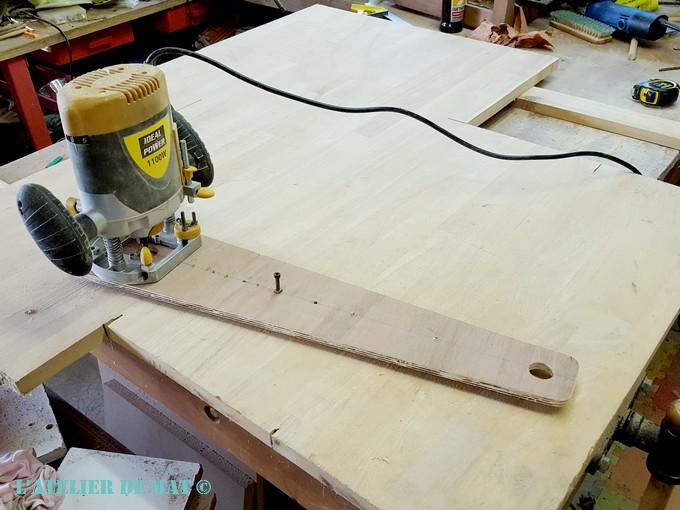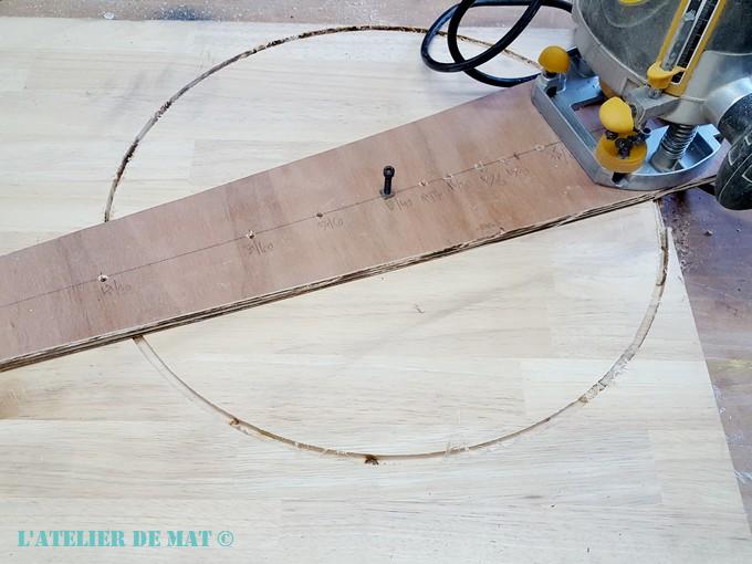 Après avoir fixé ma défonceuse à une chute de contreplaqué, j’ai utilisé le tout comme on utilise un compas. La défonceuse est équipée avec une fraise droite assez fine et la suite est assez simple : on pousse la défonceuse en s’assurant que la vis noire ne sorte pas du petit trou qu’on a percé au préalable au centre du rond à découper. A chaque tour on abaisse un peu plus la profondeur de la fraise.