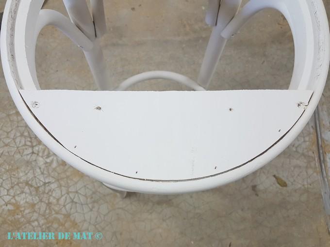 Le seul point où j’ai hésité, a été de savoir comment fixer les nouvelles assises aux tabourets. J’ai envisagé plusieurs solutions et celle que j’ai retenu consiste à réutiliser les anciennes assises provisoires en contreplaqué.