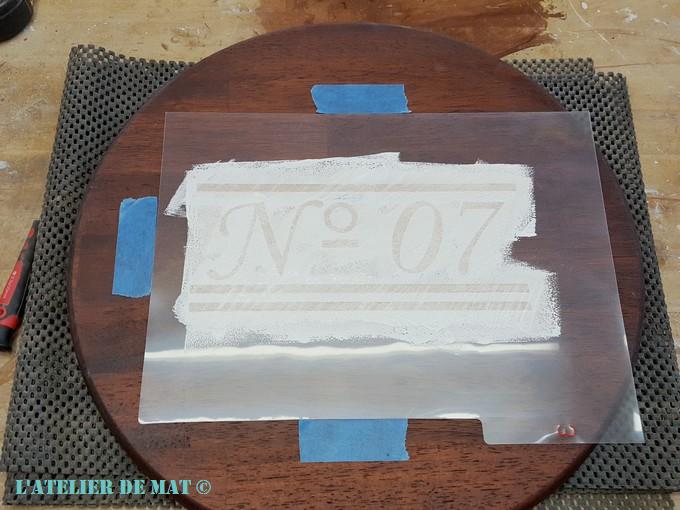 Et voila la boulette 😉 Dans tous projets on rencontre des difficultés, et on en tire des leçons. Donc autant partager celle ci si elle peut vous servir. Les traits marrons que l’on aperçoit sur le pochoir sont dûs au……vernis. En effet quand j’ai appliqué celui ci , un vernis acrylique pour meubles, cela a comme dissout la teinte et le pinceau a étalé cette misère partout.
