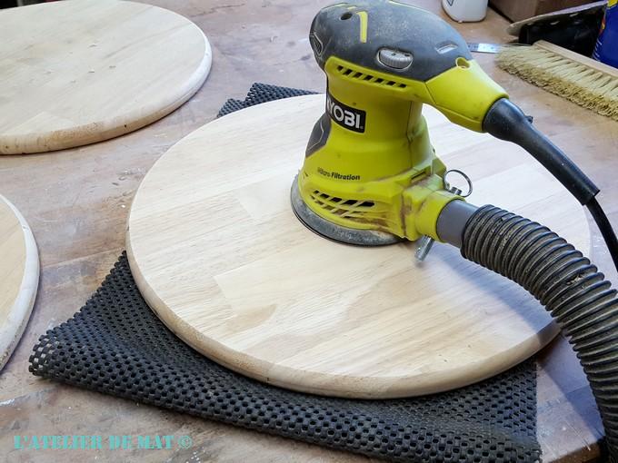 Pendant que celui-ci séchait, j’ai pu m’adonner au truc le plus déplaisant que je connaisse : le ponçage. Pour me faciliter la tâche, j’ai installé les tabourets un par un sur mon plateau tournant. J’adore ce truc, c’est vraiment trop pratique ! J’ai aussi démonté au fur à mesure les renforts entre chaque pied ainsi que l’anneau centrale pour que cette corvée soit plus aisée. J’ai choisi du papier en grain 80 car le but était de casser le vernis rapidement et non d’obtenir une surface super lisse 😉