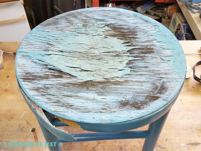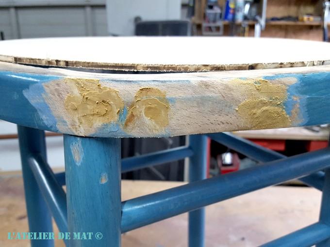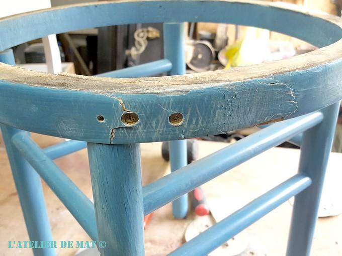 Le décollage de la ceinture du tabouret ne devait pas dater d’hier car cela n’a pas été facile de tout refaire tenir. Du coup les bords ne se sont pas remis parfaitement.