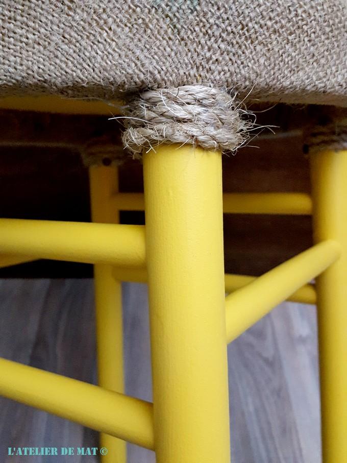 J’ai ensuite coupé la toile à ras sous l’assise et je me suis occupé de fignoler les pieds. La corde brute se mariant bien avec la toile du sac , j’ai utilisé celle-ci pour faire quelques tours à chaque pied. Cela permet notamment de masquer les agrafes et clous qui maintiennent la toile en plus de l’effet esthétique. Pour que la corde tienne bien en place et soit bien tendue, je me sers d’un pistolet à colle.