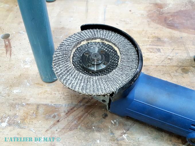 J’ai donc sorti mon nouvel outil magique: le disque à meuler 😉 J’aurais pu utiliser ma ponceuse mais c’est tellement plus rapide comme ça.