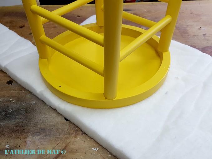 Parfois on cherche partout des éléments pour faire un projet et parfois il suffit de bric et de broc qu’on a sous la main ;). Cette étape a été plutôt simple car je me suis juste assuré que le motif était centré et j’ai utilisé mon agrafeuse pour attacher la toile à l’assise du tabouret.