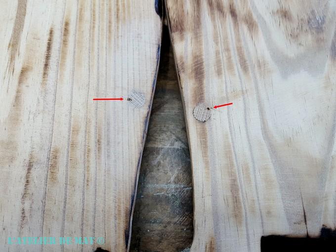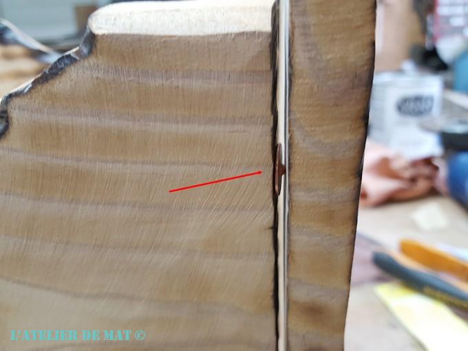 Quand la colle est sèche , il suffit de couper à ras le tourillon et le trou est bouché. J’ai mis une petite flèche rouge pour bien vous montrer l’emplacement 😉