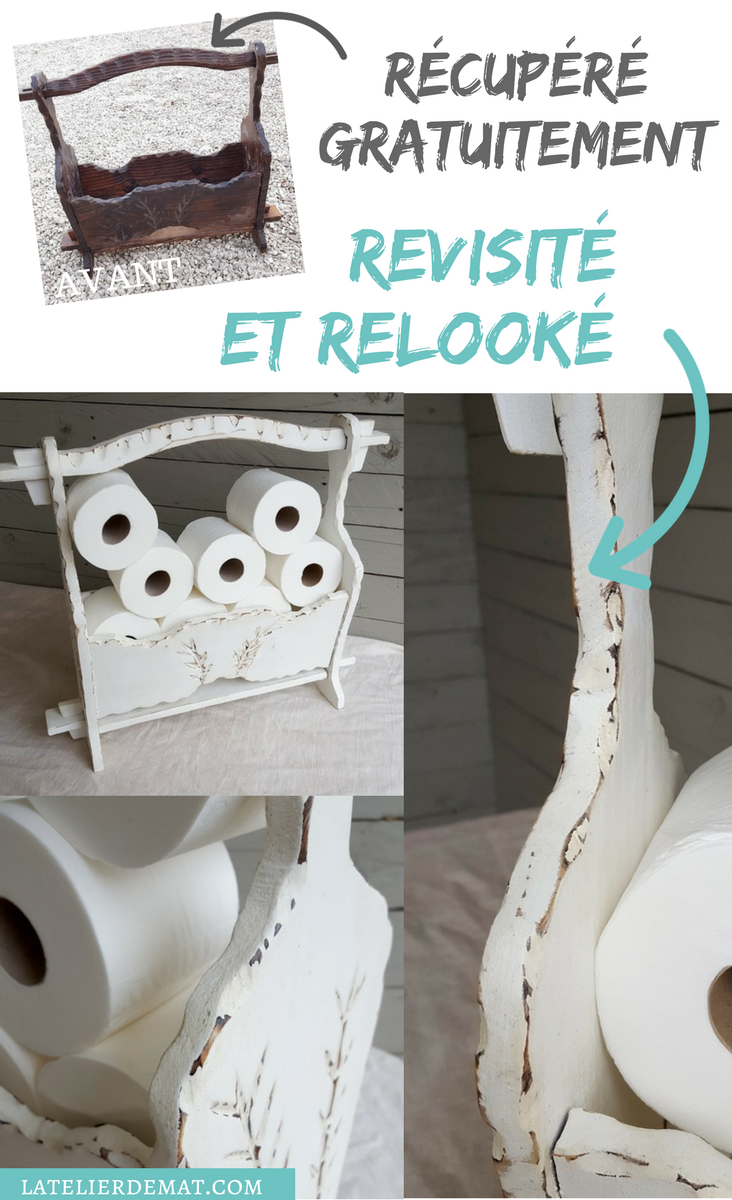 Pour illustrer la nouvelle fonction de ce porte-revue j’ai choisi de l’utiliser pour stocker des rouleaux de papier toilette. Le blanc de celui ci faisant bien ressortir l’aspect usé apporté par le ponçage, j’ai trouvé que cela faisait sympa.