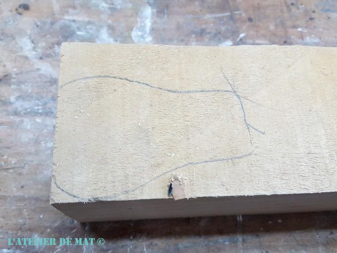 Vous le savez peut-être, mais je jette rarement du bois et heureusement car dans ce cas, j’ai mis du temps à trouver une chute assez grande pour la réparation. Il fallait en effet prendre en compte la hauteur nécessaire pour refaire la partie « boule » du pied ». Une fois trouvée, j’ai tracé les contours de la future pièce en me basant sur la découpe du pied que je venais d’effectuer
