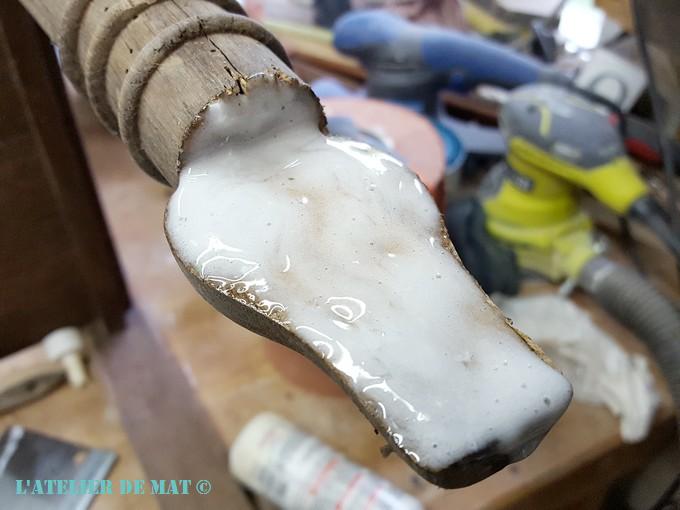 Deux heures plus tard, j’étais prêt à passer à la « sculpture » du pied de cette petite coiffeuse. A noter que la colle PU que j’ai utilisée a l’avantage de faire une mousse qui durcit en séchant. C’est beaucoup plus simple de nettoyer le surplus de colle, il suffit de tirer dessus doucement ou d’utiliser un ciseau à bois.