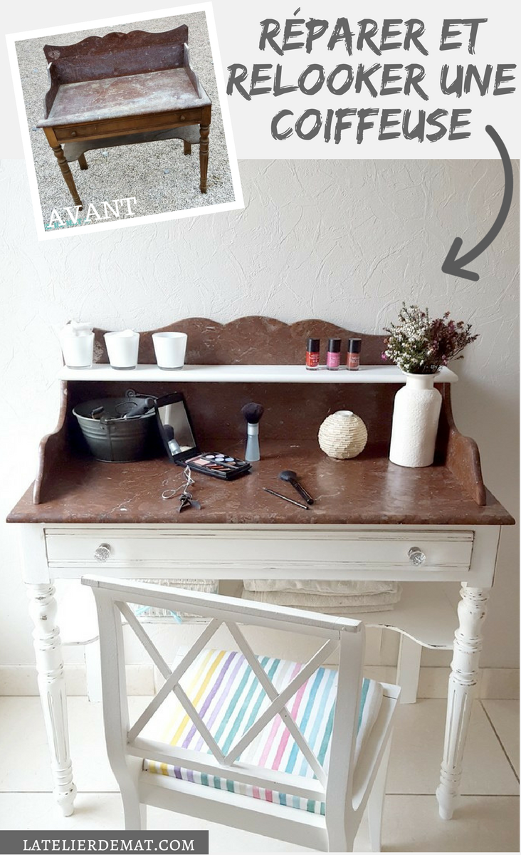 Dans un récent article, Les récups Eté-Automne 2017, je vous avais montré cette petite coiffeuse que j’avais pu récupérer gratuitement. Certains diront que c’est plus une table de toilette qu’une coiffeuse vu l’absence d’un miroir mais comme l’une est l’ancêtre de l’autre, on ne va pas se formaliser ;). Les marbres ne sont pas cassés mais il en manque un. Il devait y avoir une petite étagère horizontale reposant sur les deux cotés qui a disparu. Je ne suis pas un grand fan du marbre mais j’aime beaucoup les lignes de cette coiffeuse donc quand on me l’a proposé, vous vous doutez que j’ai vite dit « Oui ! » 😉
