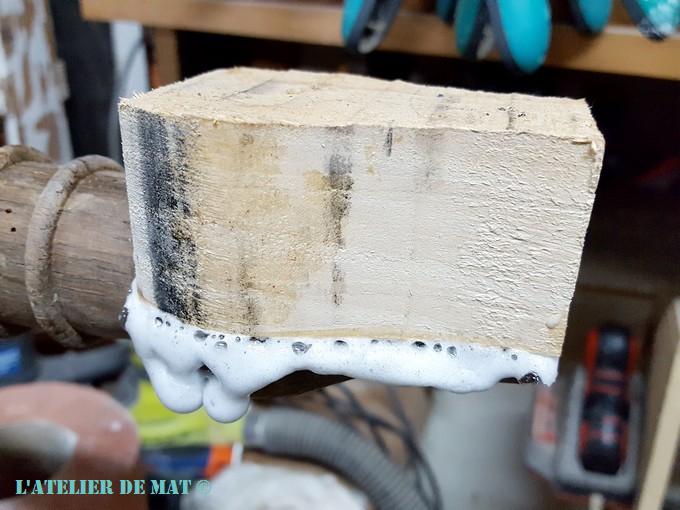 Pour le collage j’ai préféré utiliser pour de la colle PU Sader que j’avais. Celle-ci étant expansive, elle va combler les petits trous de vers qui pourraient rester et surtout elle va boucher les petits défauts de coupe que j’aurai pu réaliser. En plus c’est une colle résistante à l’humidité ce qui est un plus pour un pied de meuble.
