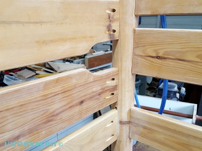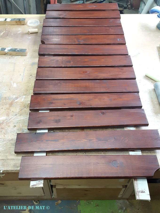 Les lattes étant légèrement trop courtes, j’ai pris l’option d’insérer une latte verticalement . Tout compte fait cela rend beaucoup mieux comme ça je trouve.