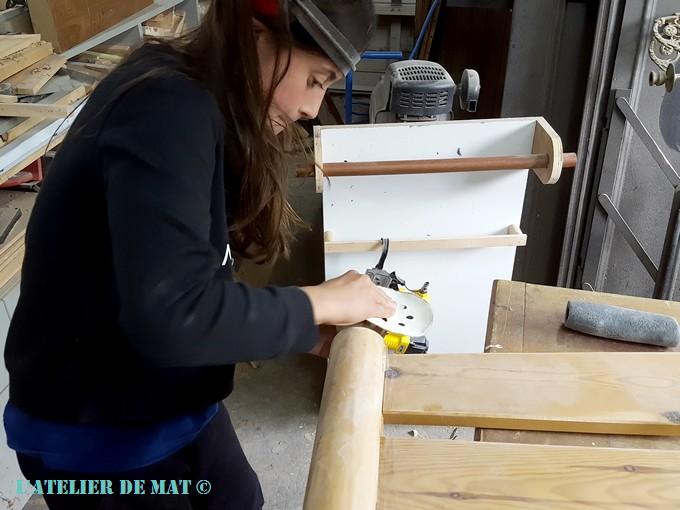 Après cela il ne me restait plus qu’à faire le sale boulot : poncer pour enlever le vernis…;) Toutes les parties planes ont été faites avec ma ponceuse orbitale Ryobi et les chants ainsi que les pieds ont été faits à la main. Heureusement, j’ai eu de l’aide de ma grande fille qui ne rechigne jamais à aider son Papou quand elle passe par l’atelier.