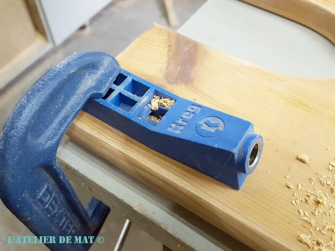 La méthode de fixation par vis de poche est aussi solide qu’une fixation par tenon mortaise d’après ce que j’ai pu lire ici et là. Elle est aussi très rapide à mettre en place et permet de se sortir parfois de casse tête quand il s’agit d’assembler des pièces, mais elle a un inconvénient à prendre en compte: il faut reboucher les trous !! 😉 Il existe des pièces toutes faites dans le commerce pour cela mais je préfère utiliser une baguette.