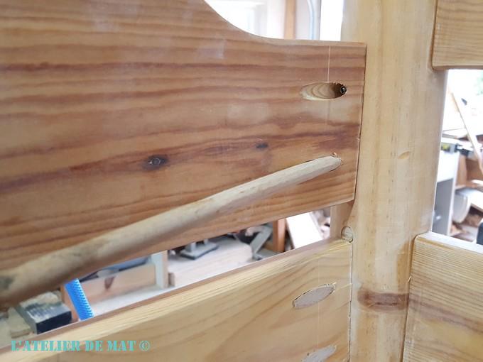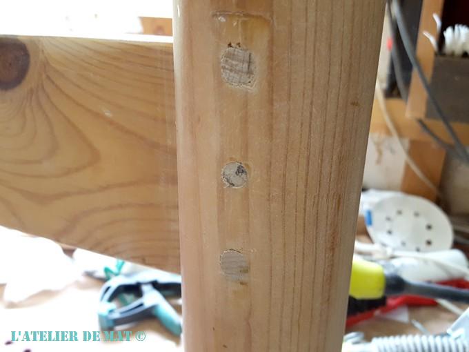 Avant d’aller plus loin j’en ai profité pour boucher les trous laissés par l’ancien mode d’assemblage du lit. Pour boucher un trou de tourillon, il suffit de mettre un peu de colle dans le trou, d’y insérer un tourillon du bon diamètre et de le couper à ras. Facile et très efficace ;).
