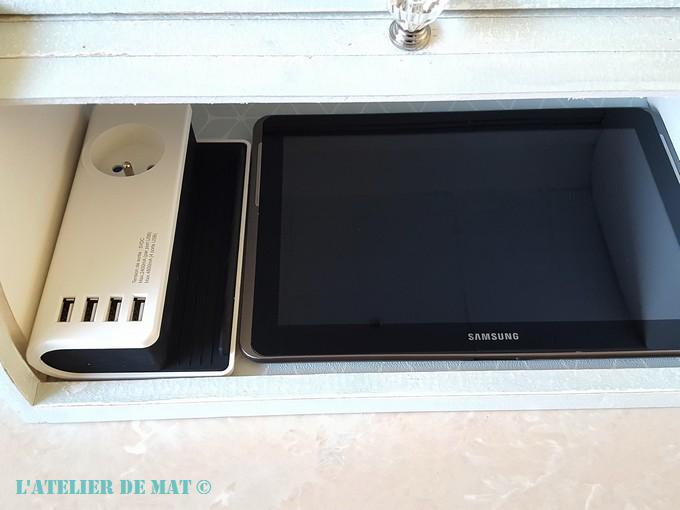 Et voila comment mon coin à chargeur a évolué. C’est déjà beaucoup mieux non? Plus besoin de débrancher en douce le téléphone de ma petite femme pour charger le mien ;).