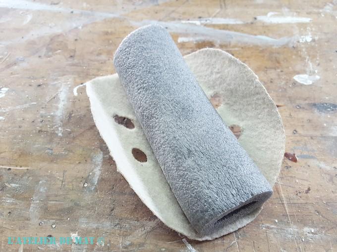 Ensuite je me suis armé de ma cale à poncer « maison ». C’est un vieux disque de ponceuse en grain 120 et un bout de tube en mousse. C’est très pratique car cela permet de poncer pleins de formes sans les abimer. Avec j’ai poncé l’intégralité de la boite pour créer une patine.