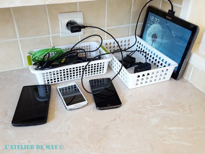 Voila le fameux coin qui chez moi accueille les chargeurs, les téléphones et la tablette. Et comme il n’y a qu’une prise dans ces environs , c’est un peu la guerre pour tout brancher. Au passage ne faites pas attention au plan de travail ou à la crédence, je suis en location et je ne peux pas refaire ce coin 😉